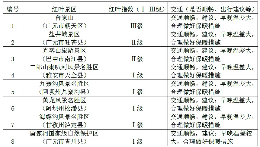 据悉,四川根据省内各主要红叶景区所处的地理位置、环境气候条件以及树叶变色的程度等,将“红叶指数”分为Ⅲ级。“Ⅰ级红叶指数”代表叶子变色率为10%~35%之间,处于叶片发黄状态,较适宜出游观赏;“Ⅱ级红叶指数”代表叶片变色率为35%~60%之间,处于红黄与橙红之间,适宜观赏;“Ⅲ级红叶指数”代表叶片变色率为60%~95%之间,全部呈深红、暗红或紫红色,是观赏红叶的最佳时期。